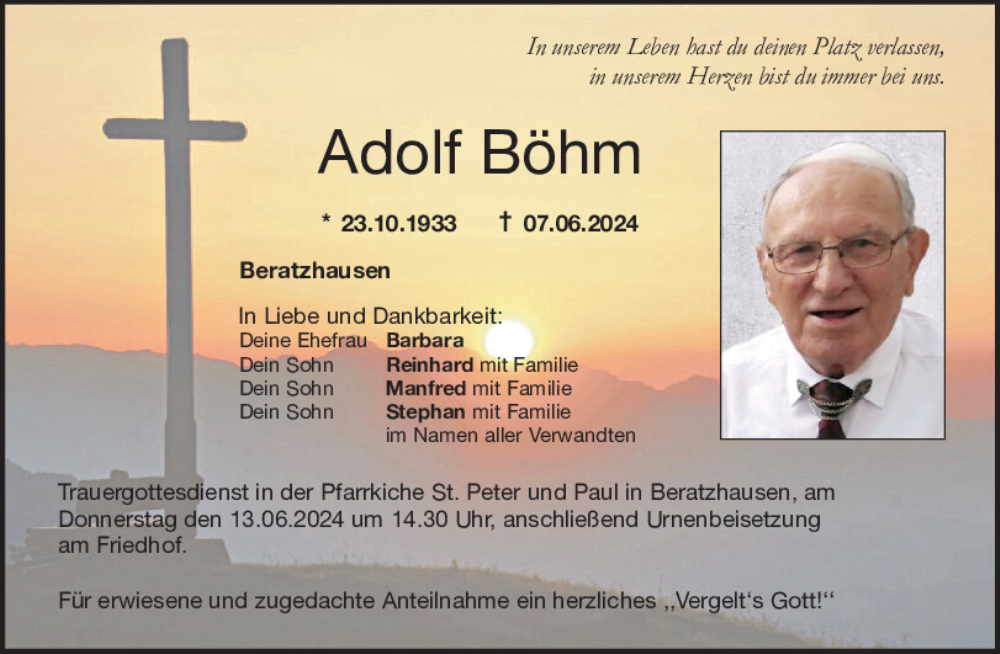 Hier finden Sie alle Traueranzeigen aus der Zeitung, die bisher für Adolf Böhm erschienen sind.