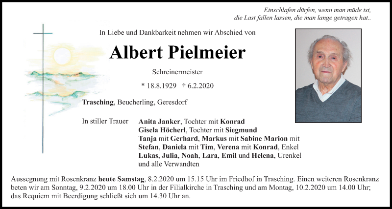 Hier finden Sie alle Traueranzeigen aus der Zeitung, die bisher für Albert Pielmeier erschienen sind.