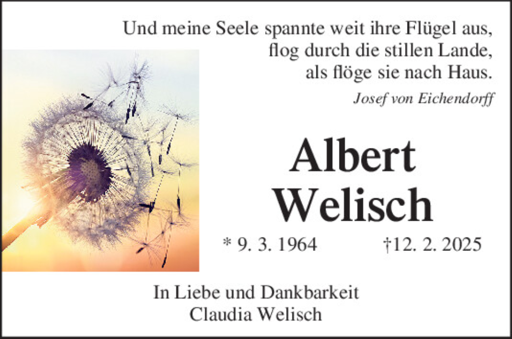 Hier finden Sie alle Traueranzeigen aus der Zeitung, die bisher für Albert Welisch erschienen sind.