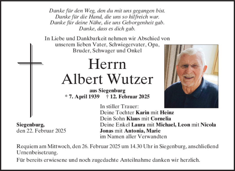 Hier finden Sie alle Traueranzeigen aus der Zeitung, die bisher für Albert Wutzer erschienen sind.