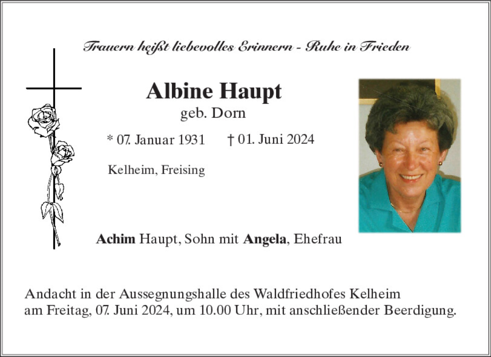 Hier finden Sie alle Traueranzeigen aus der Zeitung, die bisher für Albine Haupt erschienen sind.