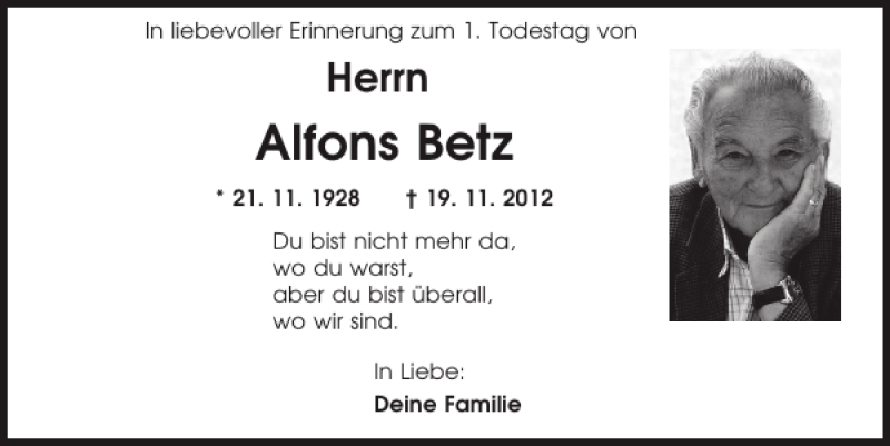 Hier finden Sie alle Traueranzeigen aus der Zeitung, die bisher für Alfons Betz erschienen sind.