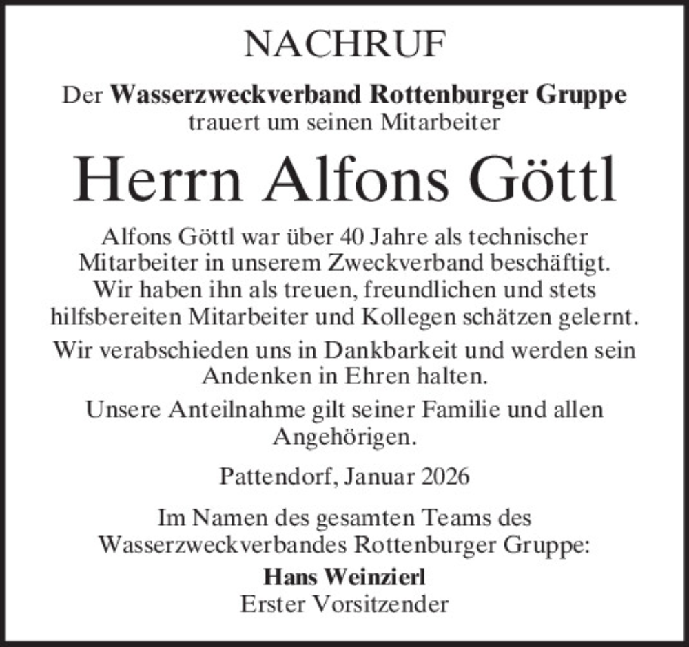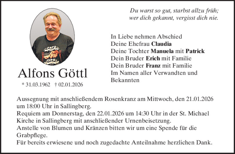 Hier finden Sie alle Traueranzeigen aus der Zeitung, die bisher für Alfons Göttl erschienen sind.