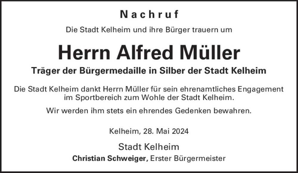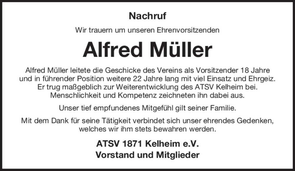 Hier finden Sie alle Traueranzeigen aus der Zeitung, die bisher für Alfred Müller erschienen sind.