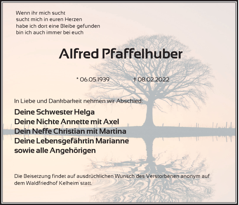 Hier finden Sie alle Traueranzeigen aus der Zeitung, die bisher für Alfred Pfaffelhuber erschienen sind.
