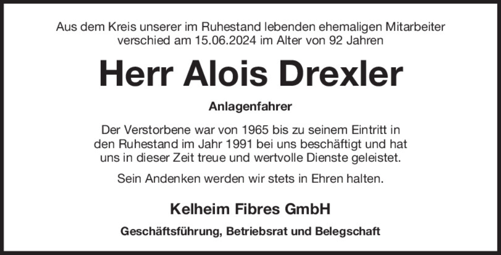 Hier finden Sie alle Traueranzeigen aus der Zeitung, die bisher für Alois Drexler erschienen sind.