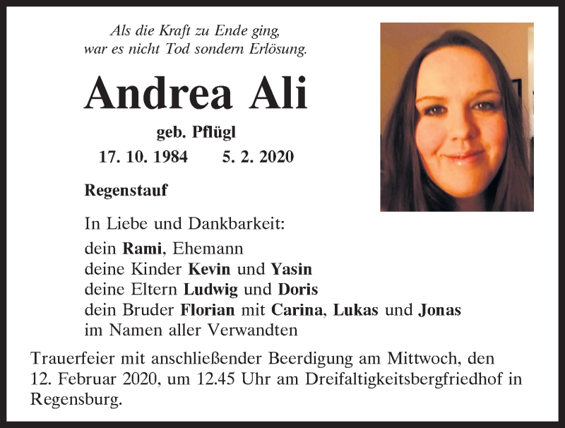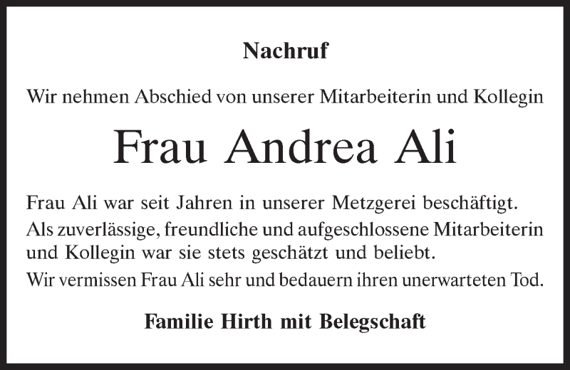 Hier finden Sie alle Traueranzeigen aus der Zeitung, die bisher für Andrea Ali erschienen sind.