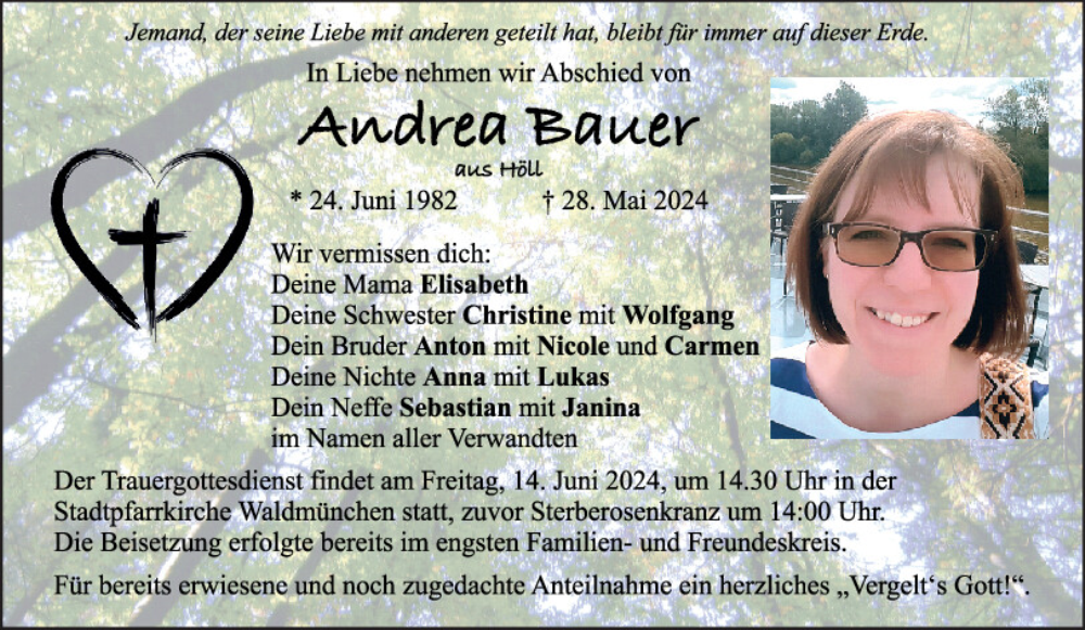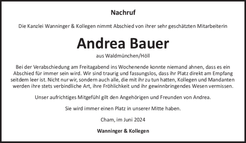 Hier finden Sie alle Traueranzeigen aus der Zeitung, die bisher für Andrea Bauer erschienen sind.
