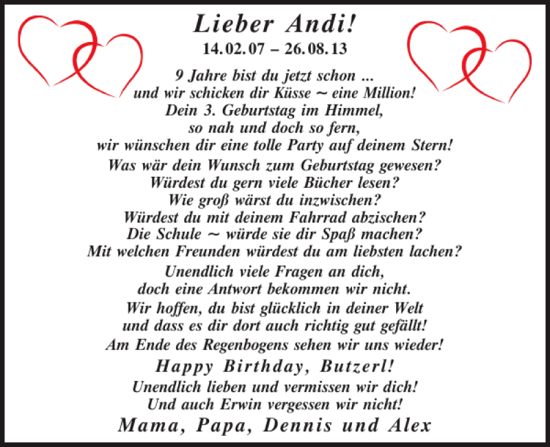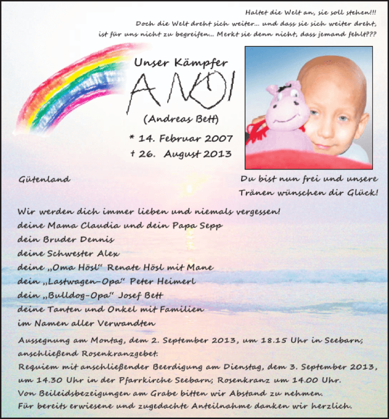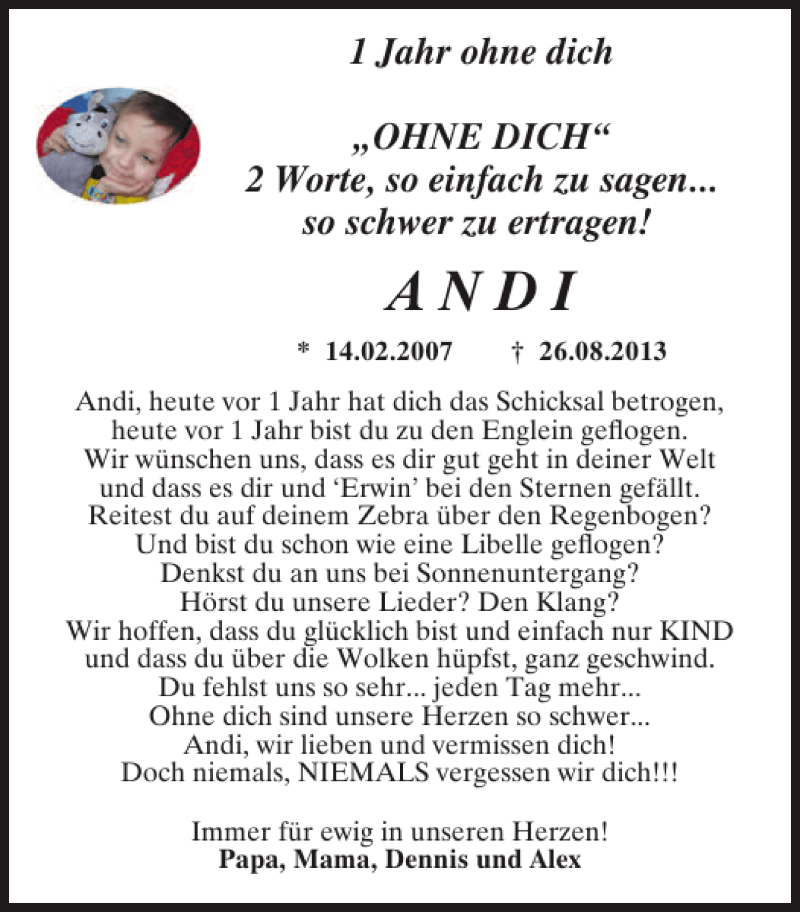 Hier finden Sie alle Traueranzeigen aus der Zeitung, die bisher für Andreas Bett erschienen sind.