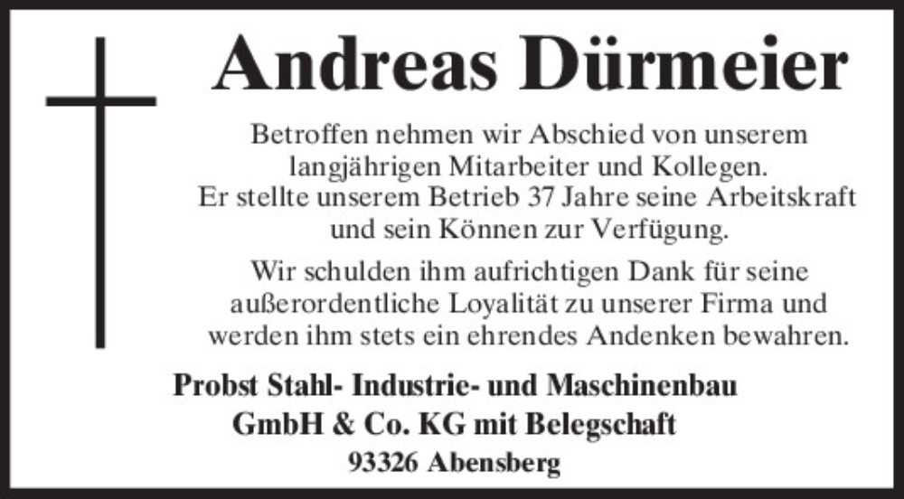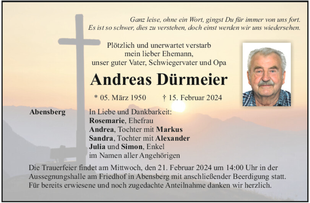 Hier finden Sie alle Traueranzeigen aus der Zeitung, die bisher für Andreas Dürmeier erschienen sind.