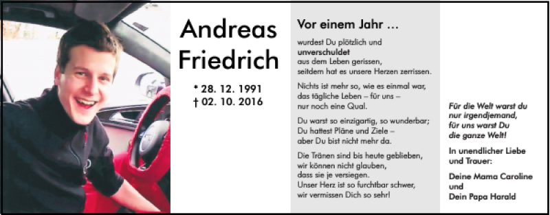 Hier finden Sie alle Traueranzeigen aus der Zeitung, die bisher für Andreas Friedrich erschienen sind.