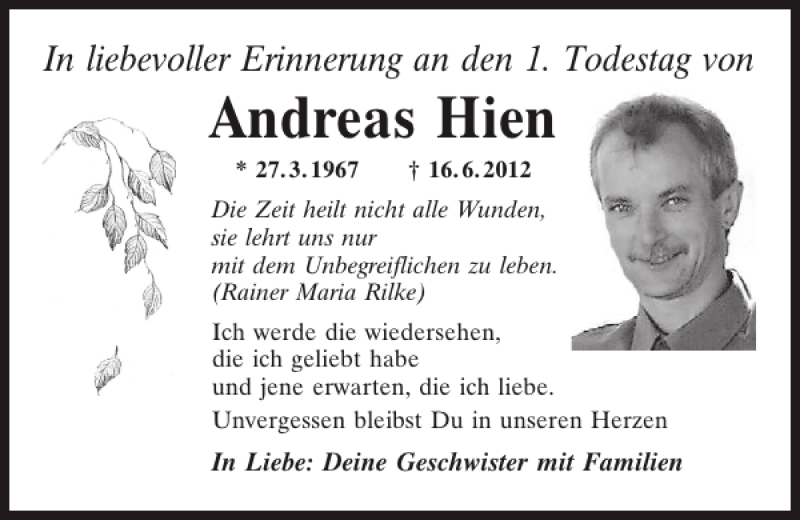 Hier finden Sie alle Traueranzeigen aus der Zeitung, die bisher für Andreas Hien erschienen sind.
