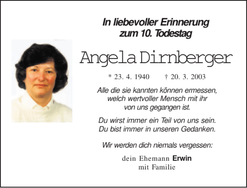 Hier finden Sie alle Traueranzeigen aus der Zeitung, die bisher für Angela Dirnberger erschienen sind.