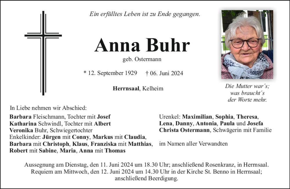Hier finden Sie alle Traueranzeigen aus der Zeitung, die bisher für Anna Buhr erschienen sind.