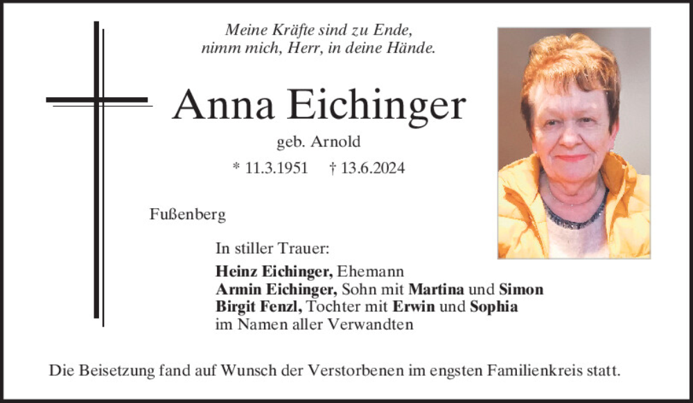 Hier finden Sie alle Traueranzeigen aus der Zeitung, die bisher für Anna Eichinger erschienen sind.