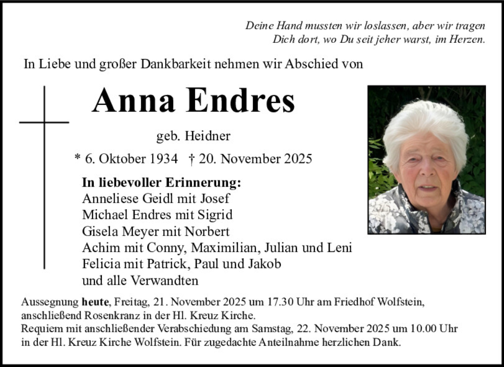Hier finden Sie alle Traueranzeigen aus der Zeitung, die bisher für Anna Endres erschienen sind.