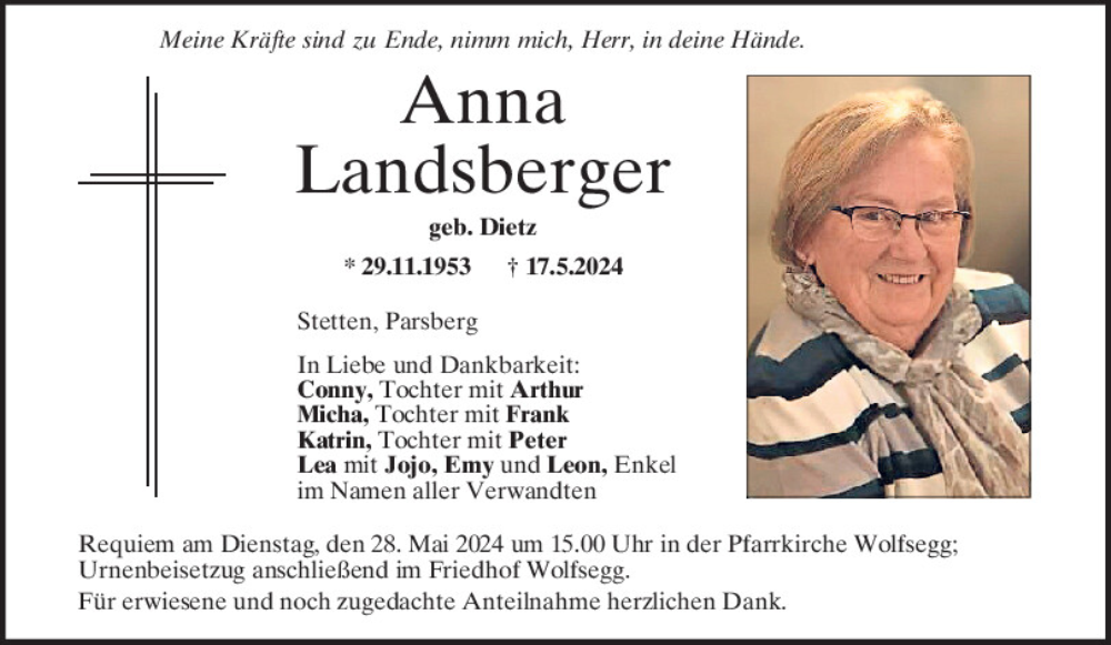 Hier finden Sie alle Traueranzeigen aus der Zeitung, die bisher für Anna Landsberger erschienen sind.