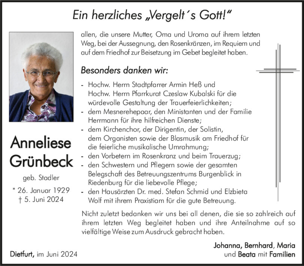Hier finden Sie alle Traueranzeigen aus der Zeitung, die bisher für Anneliese Grünbeck erschienen sind.