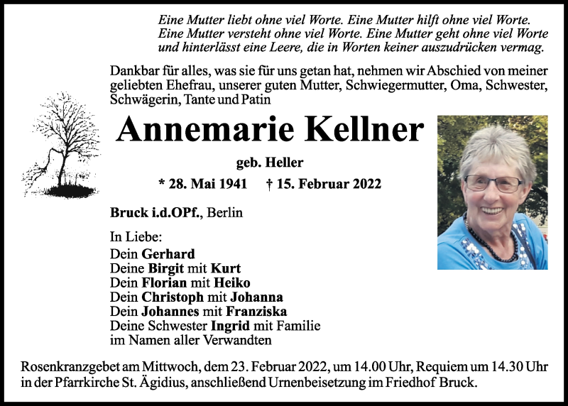 Hier finden Sie alle Traueranzeigen aus der Zeitung, die bisher für Annemarie Kellner erschienen sind.