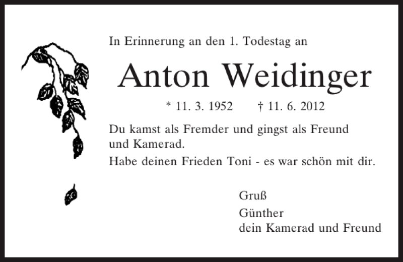 Hier finden Sie alle Traueranzeigen aus der Zeitung, die bisher für Anton Weidinger erschienen sind.