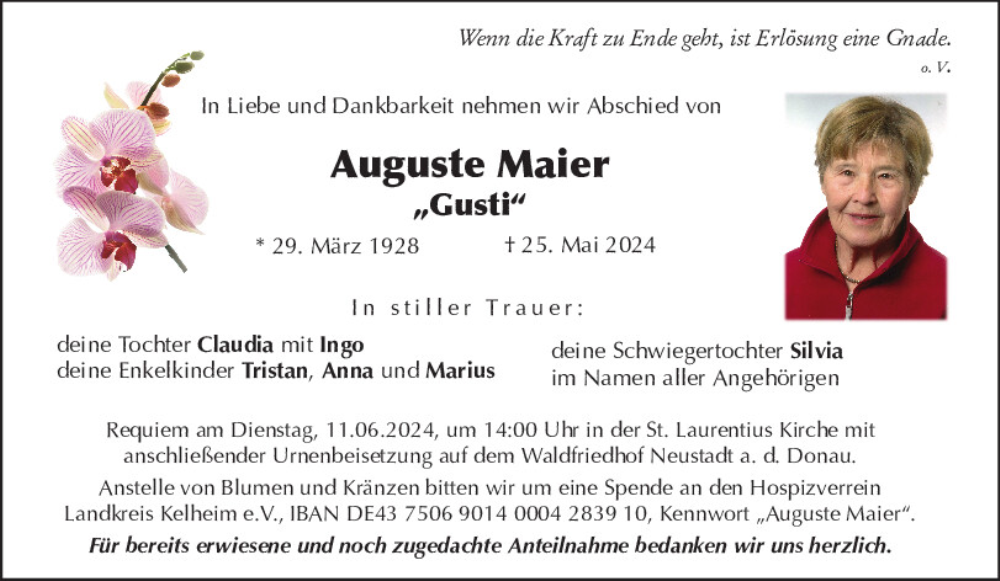 Hier finden Sie alle Traueranzeigen aus der Zeitung, die bisher für Auguste Maier erschienen sind.