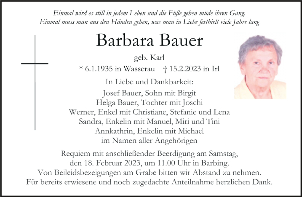 Hier finden Sie alle Traueranzeigen aus der Zeitung, die bisher für Barbara Bauer erschienen sind.
