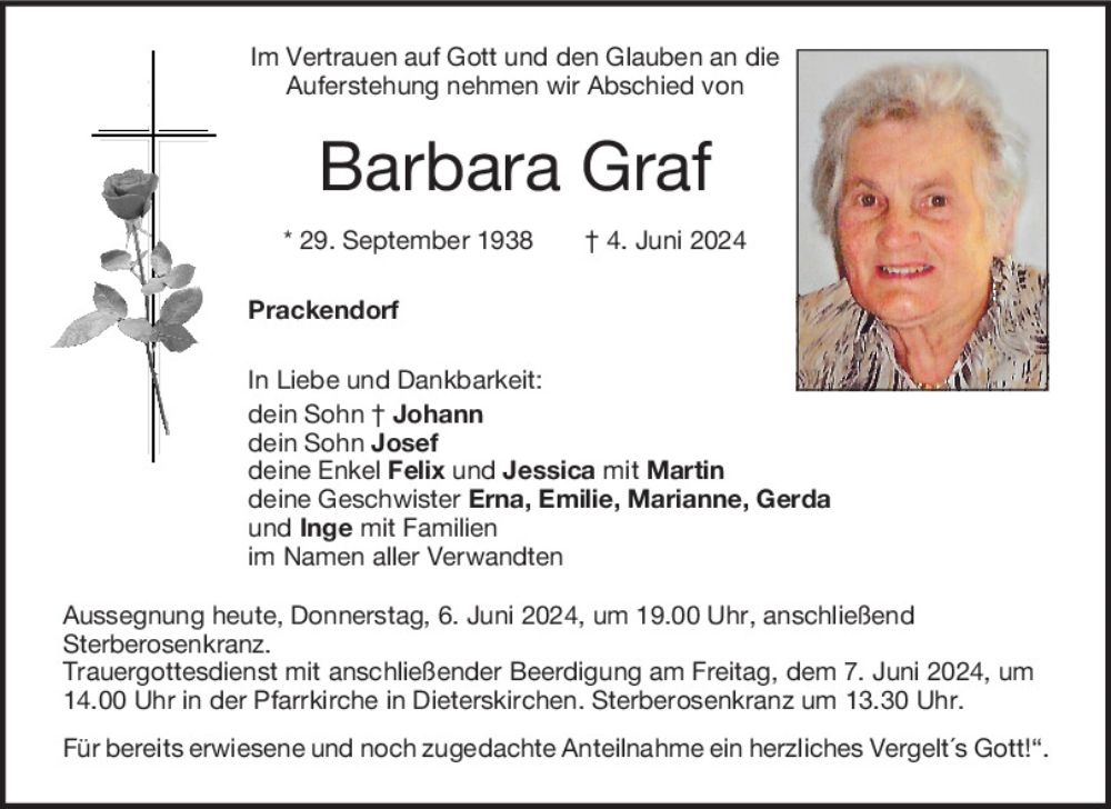 Hier finden Sie alle Traueranzeigen aus der Zeitung, die bisher für Barbara Graf erschienen sind.