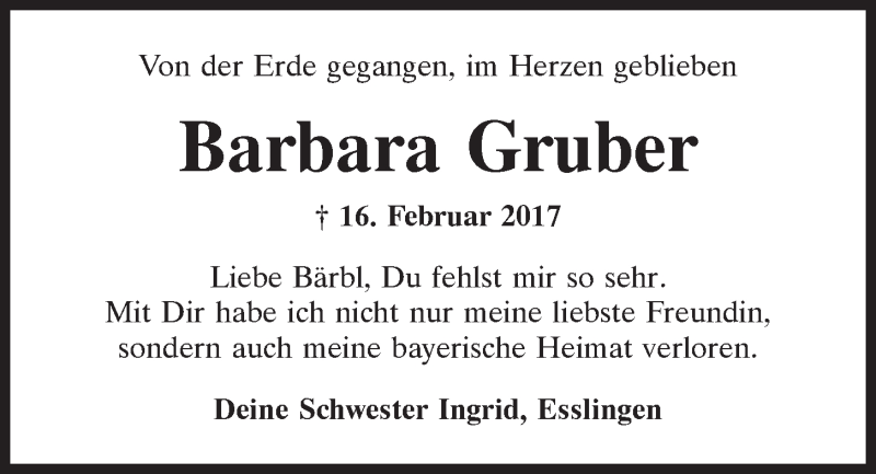 Hier finden Sie alle Traueranzeigen aus der Zeitung, die bisher für Barbara Gruber erschienen sind.