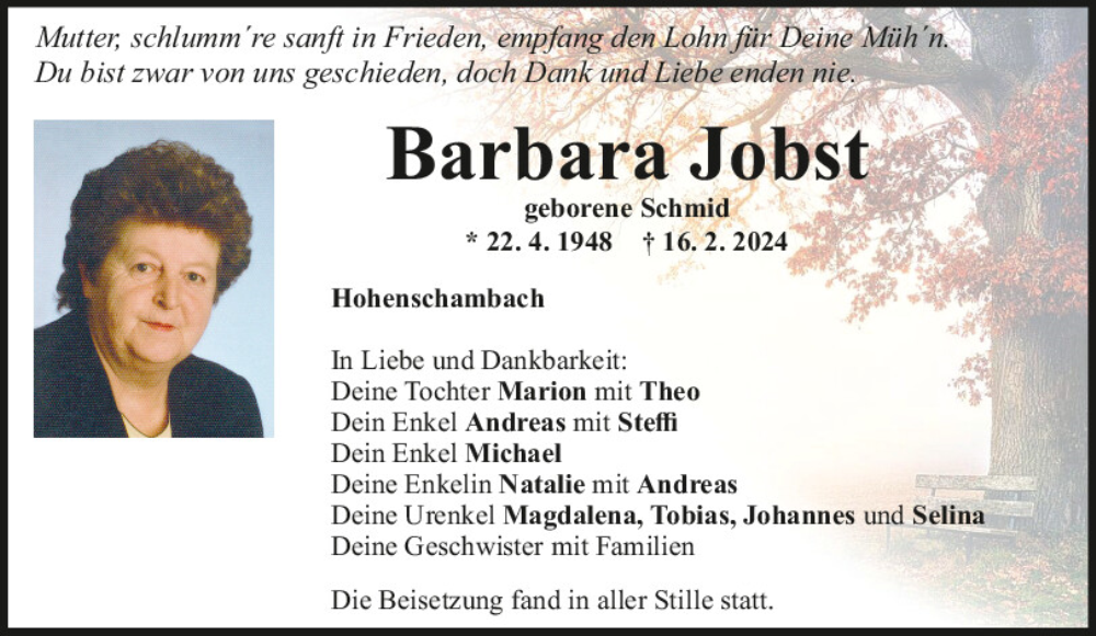 Hier finden Sie alle Traueranzeigen aus der Zeitung, die bisher für Barbara Jobst erschienen sind.