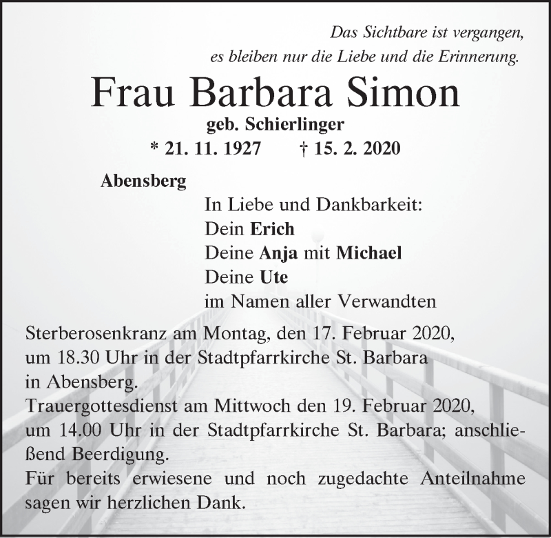 Hier finden Sie alle Traueranzeigen aus der Zeitung, die bisher für Barbara Simon erschienen sind.