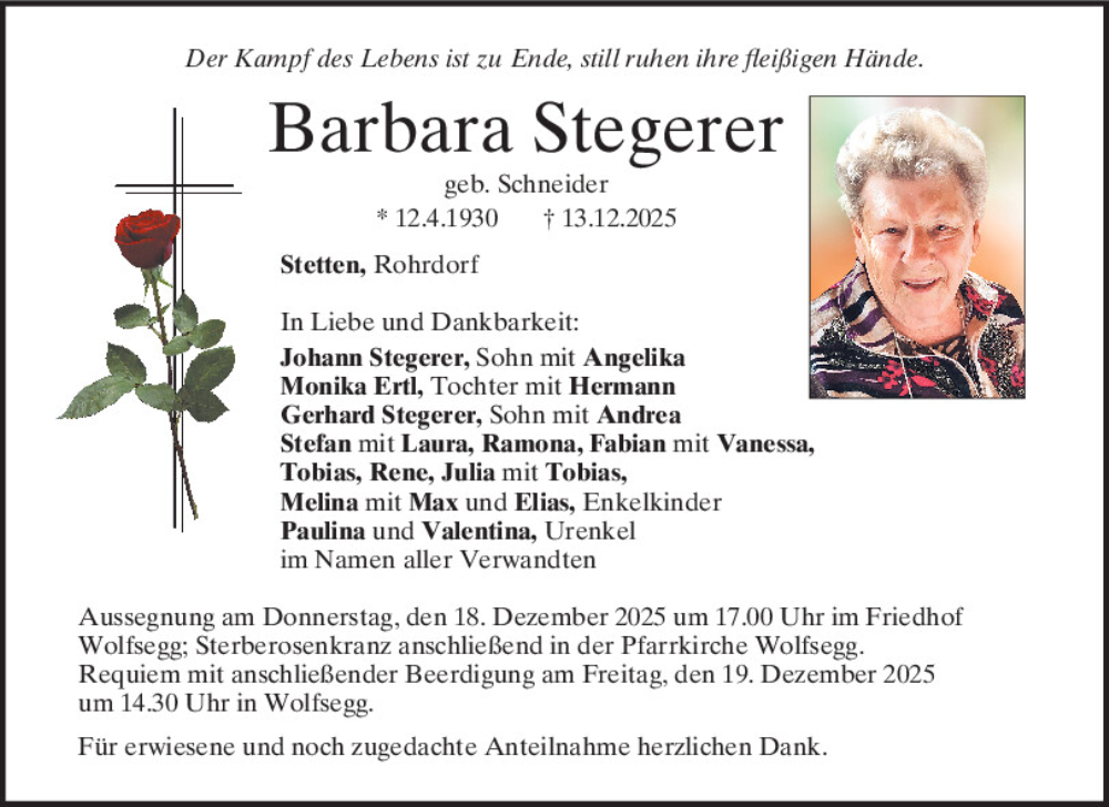 Hier finden Sie alle Traueranzeigen aus der Zeitung, die bisher für Barbara Stegerer erschienen sind.
