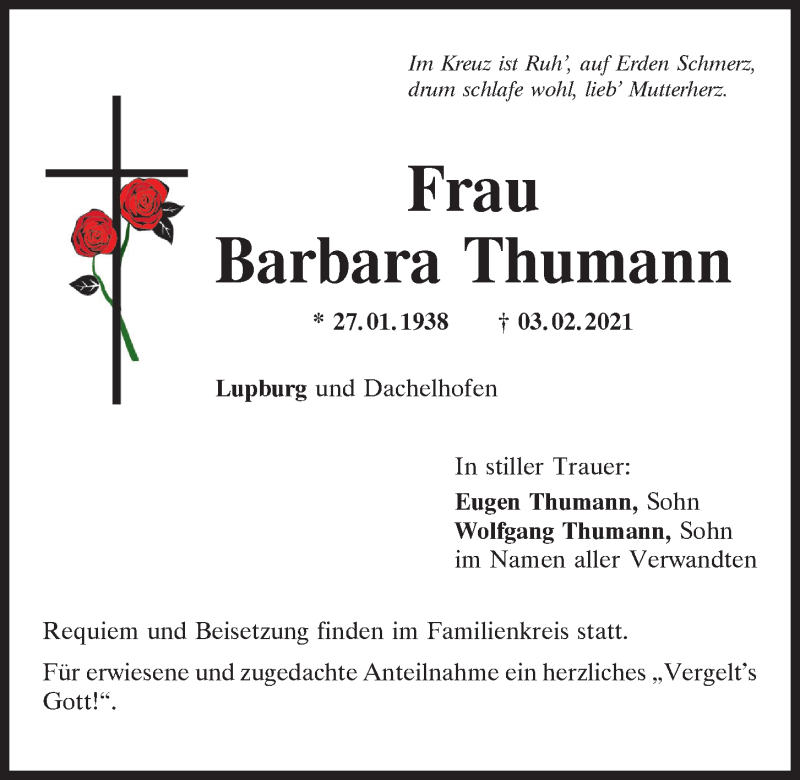 Hier finden Sie alle Traueranzeigen aus der Zeitung, die bisher für Barbara Thumann erschienen sind.