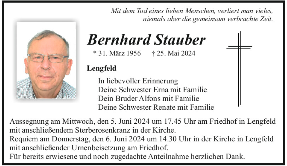 Hier finden Sie alle Traueranzeigen aus der Zeitung, die bisher für Bernhard Stauber erschienen sind.