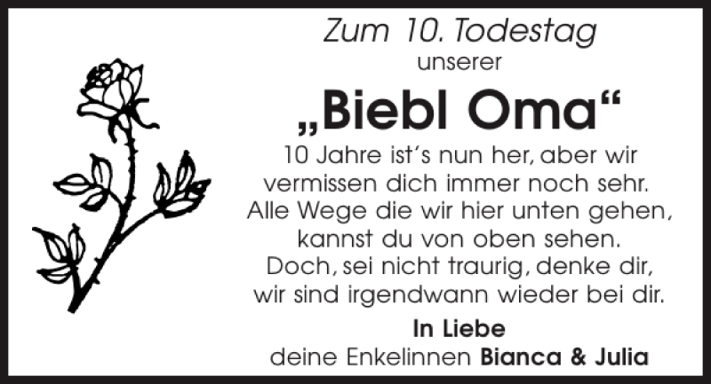 Hier finden Sie alle Traueranzeigen aus der Zeitung, die bisher für Biebl Oma erschienen sind.