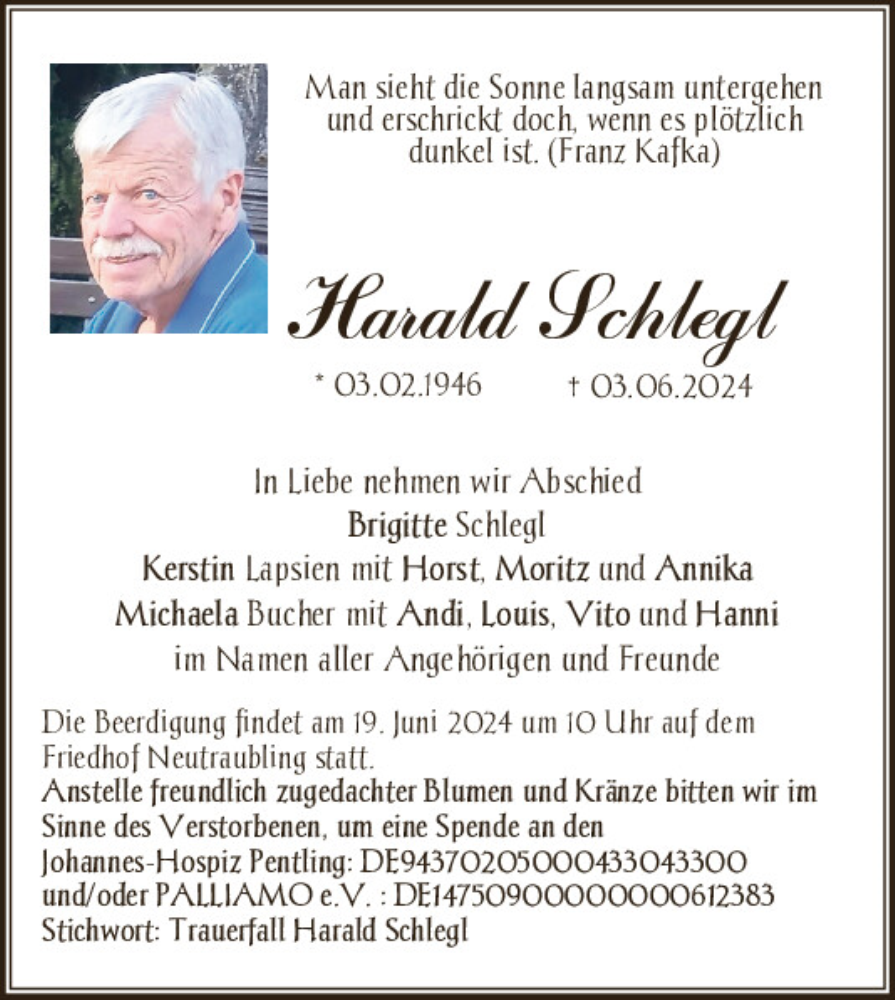 Hier finden Sie alle Traueranzeigen aus der Zeitung, die bisher für Harald Schlegl erschienen sind.
