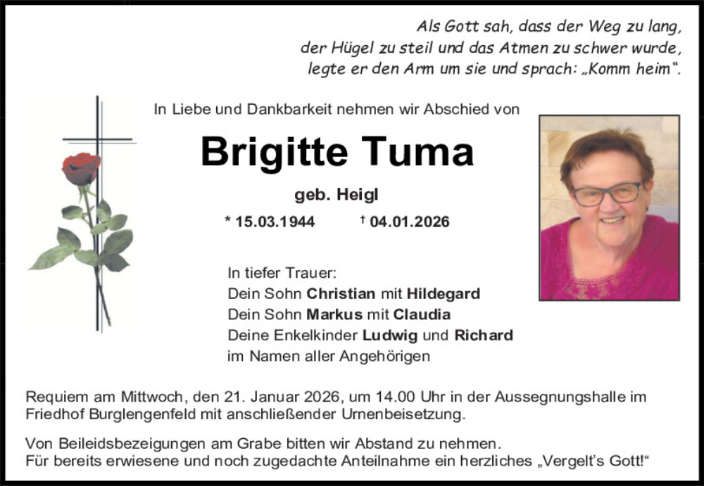 Hier finden Sie alle Traueranzeigen aus der Zeitung, die bisher für Brigitte Tuma erschienen sind.