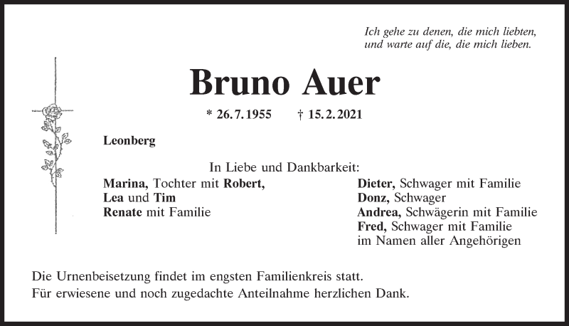 Hier finden Sie alle Traueranzeigen aus der Zeitung, die bisher für Bruno Auer erschienen sind.