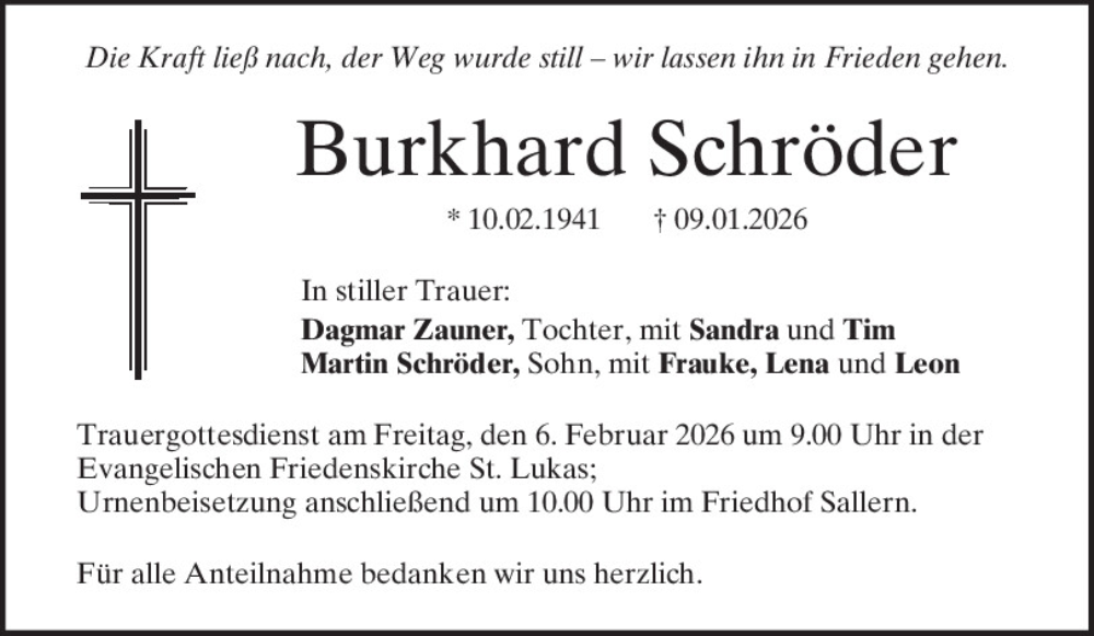 Hier finden Sie alle Traueranzeigen aus der Zeitung, die bisher für Burkhard Schröder erschienen sind.