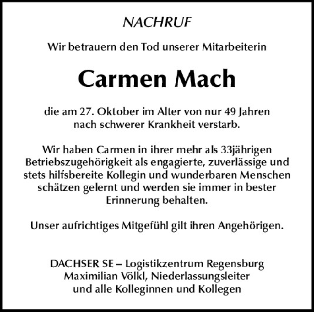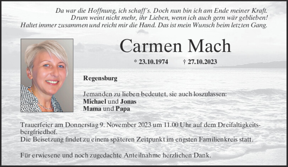 Hier finden Sie alle Traueranzeigen aus der Zeitung, die bisher für Carmen Mach erschienen sind.