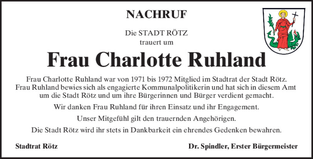 Hier finden Sie alle Traueranzeigen aus der Zeitung, die bisher für Charlotte Ruhland erschienen sind.
