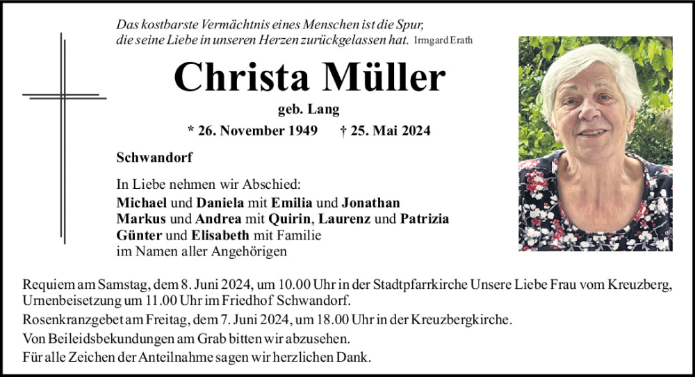 Hier finden Sie alle Traueranzeigen aus der Zeitung, die bisher für Christa Müller erschienen sind.