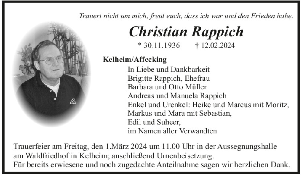 Hier finden Sie alle Traueranzeigen aus der Zeitung, die bisher für Christian Rappich erschienen sind.