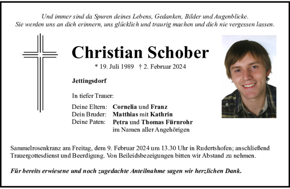 Hier finden Sie alle Traueranzeigen aus der Zeitung, die bisher für Christian Schober erschienen sind.