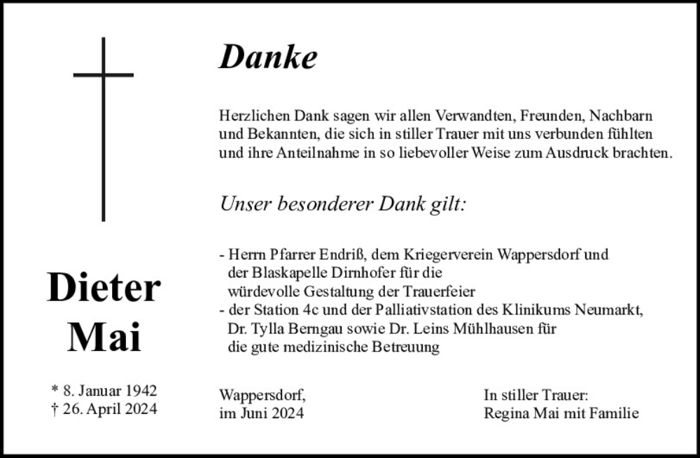 Hier finden Sie alle Traueranzeigen aus der Zeitung, die bisher für Dieter Mai erschienen sind.