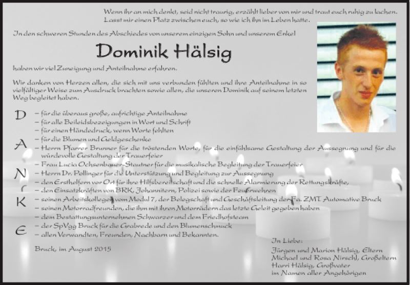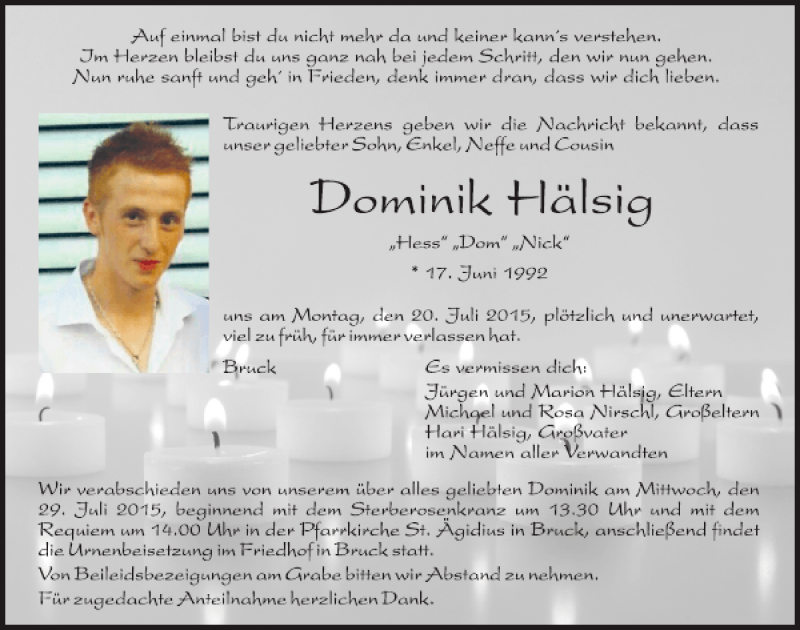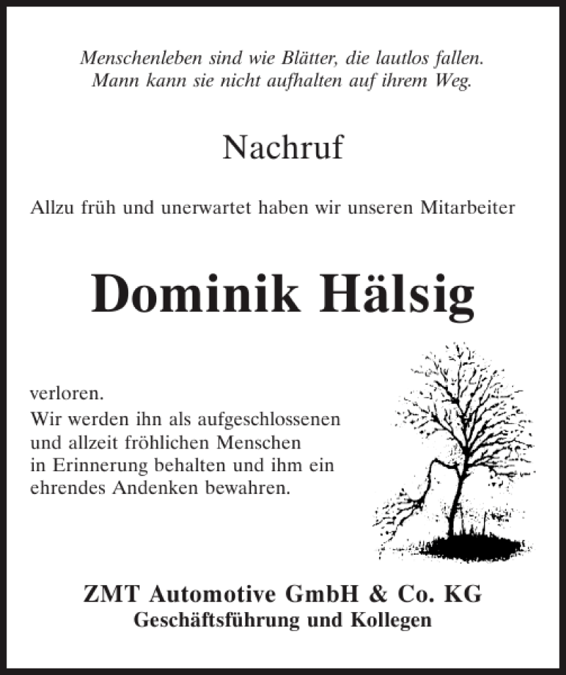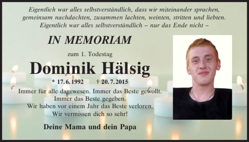 Hier finden Sie alle Traueranzeigen aus der Zeitung, die bisher für Dominik Hälsig erschienen sind.