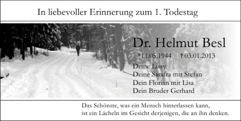 Hier finden Sie alle Traueranzeigen aus der Zeitung, die bisher für Dr. Helmut Besl erschienen sind.