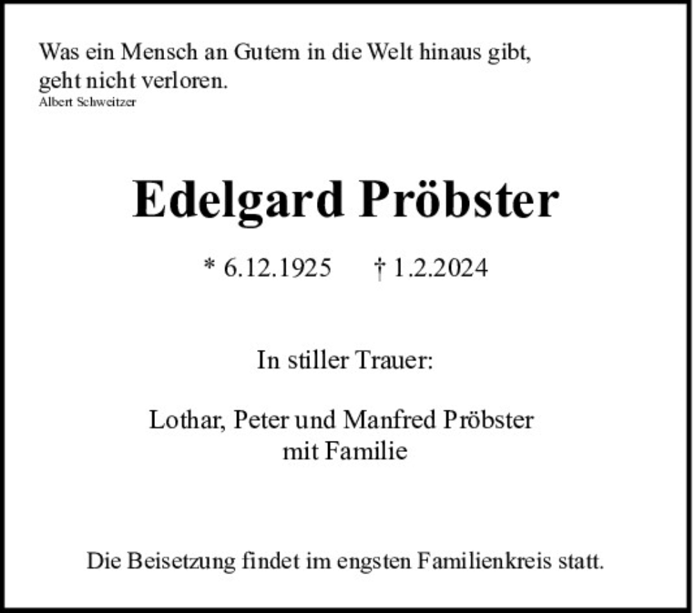 Hier finden Sie alle Traueranzeigen aus der Zeitung, die bisher für Edelgard Pröbster erschienen sind.