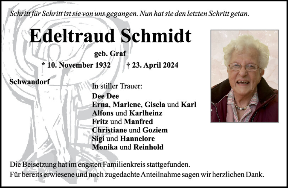 Hier finden Sie alle Traueranzeigen aus der Zeitung, die bisher für Edeltraud Schmidt erschienen sind.