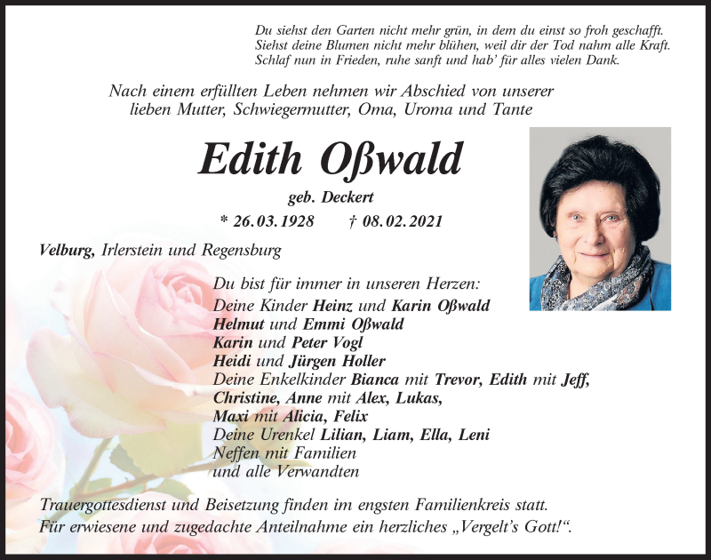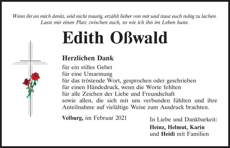 Hier finden Sie alle Traueranzeigen aus der Zeitung, die bisher für Edith Oßwald erschienen sind.