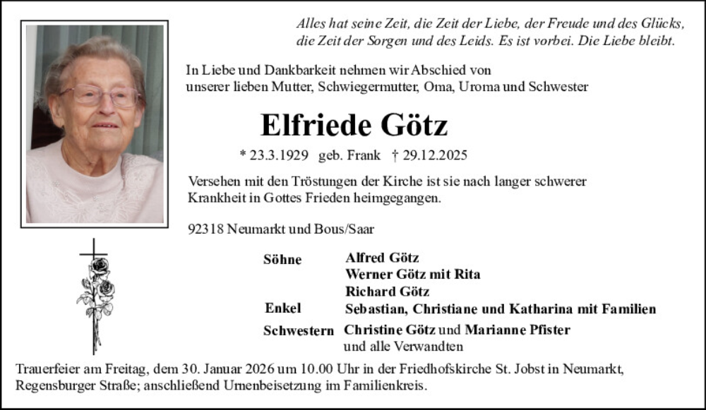 Hier finden Sie alle Traueranzeigen aus der Zeitung, die bisher für Elfriede Götz erschienen sind.
